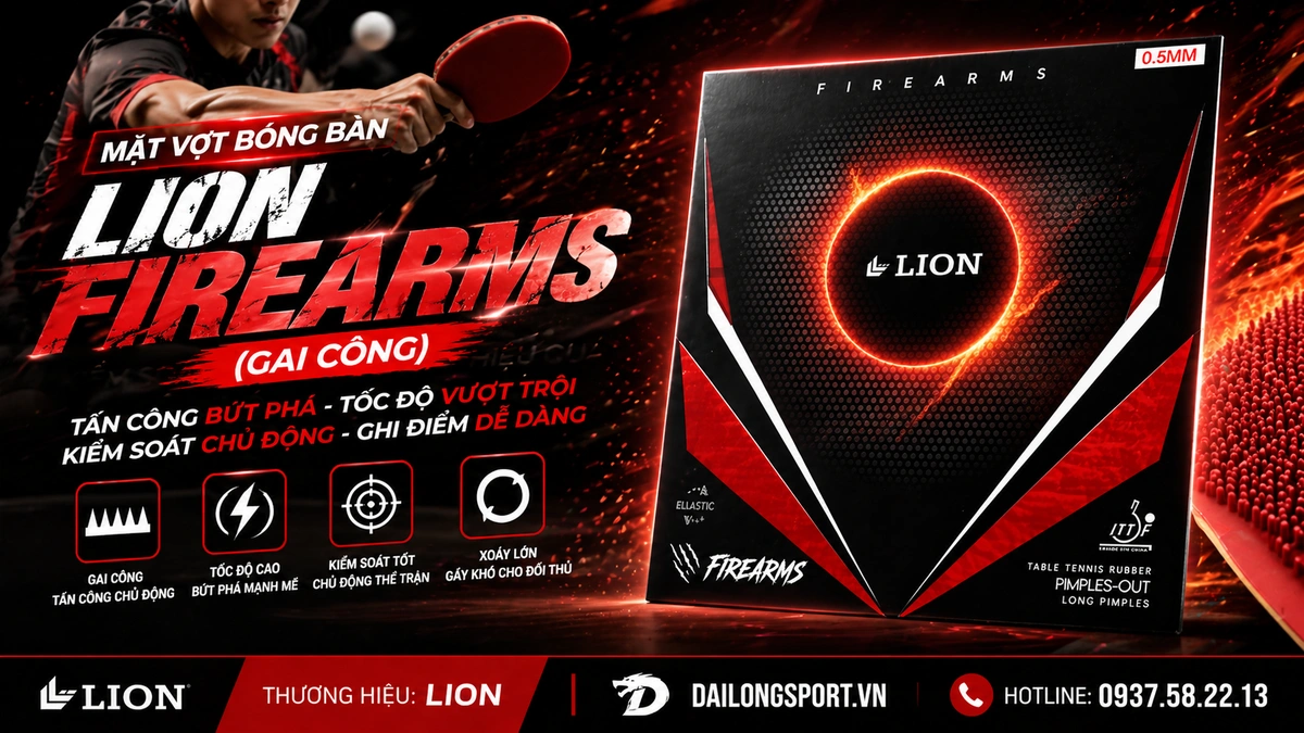 Tuy nhiên, tìm được một mặt vợt bóng bàn gai công vừa có tốc độ xé gió, vừa mang lại hiệu ứng bóng “chuội lủi” (sinking effect) khốc liệt lại là một bài toán khó. Hôm nay, Đại Long Sports vô cùng tự hào được giới thiệu và giải mã một siêu phẩm đáp ứng hoàn hảo hai tiêu chí đó: Mặt Vợt Bóng Bàn Lion Firearms (Gai Công). Với mức giá niêm yết vô cùng cạnh tranh chỉ 550,000₫, sản phẩm này được ví như một khẩu súng máy (Firearms) trên bàn đấu, sẵn sàng nã đạn và xuyên thủng mọi hàng phòng ngự.